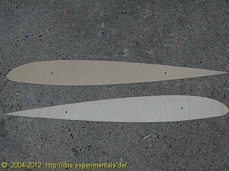 Canard wing tips on an IBIS come in two flavors: the original round one, and the more recent slightly triangular one. Since the designer claims that the more recent version produces less resistance, I opted to build that one. This new style wingtip needs an extra rib (no. 5 rib) and the template shown adjacent is what I used to create two extra ribs.