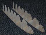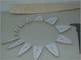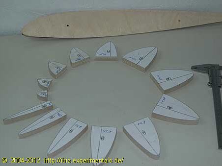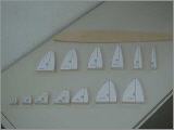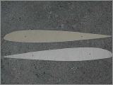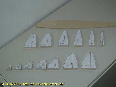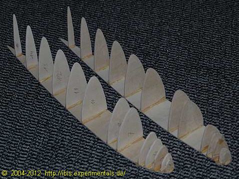 These are the ribs I made with the template shown below. Square to these full ribs a number of small former ribs are glued that define the outline of the canard wing tip. The space in between these former ribs will be filled up with foam. After the foam is sanded down to the final tip shape, the surface gets a glass/epoxy covering.