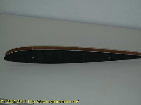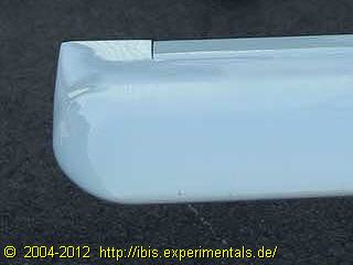 This picture shows what the new style canard wing tip looks like. This particular canard wing is the one on Henri Gallipot's very nice F-PGLP, but three more IBIS'es are currently flying with these new style canard wing tips: F-PBIS, F-PXPY and S5-MMA. Also, at least one builder (Christian Boutonnat) confirmed to me that he's ripping the original style wing tip apart to make place for the more recent version.