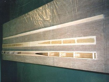 The picture shows what the canard spar center filler block looks like. The light colored wood is ash. This filler block is feathered into a upper and lower spar cap, both of which are not shown here.
