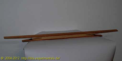 After completion, four mounting holes are drilled through the solid ash center piece. Through these four holes, the canard wing is bolted onto the fuselage front bulkhead.