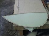 In this stage the canard tip form ribs are sawn out. From previous experience I learned that it is best to use sacrificial layers of plywood when you intend to use a rotary disc sander. The upper and lower plywood layers are sacrificial, the middle two layers are the ones that end up in the wing tips. Using sacrificial layers on top and on the bottom of the stack keeps the inner layers of plywood very clean.