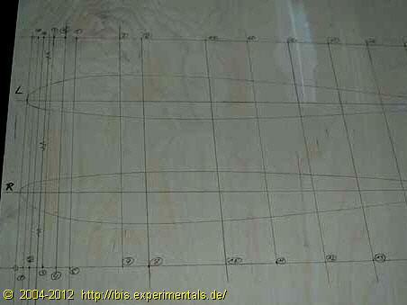 Canard wing tip assembly board with no.5 rib outline and stations marked for perpendicular forming ribs