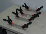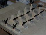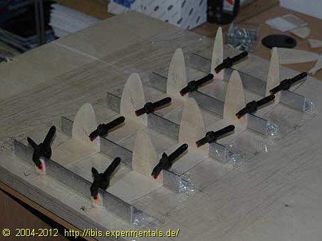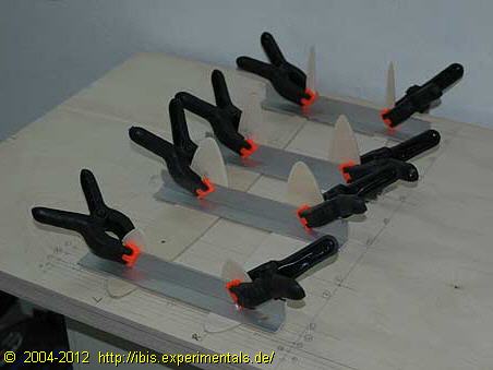The former ribs near the nose are very close to each other, there is not enough space for an aluminium angle for all of them at once. I'll start the glueing at the nose and do that section in multple runs. After that, the remainder of the former ribs can be glued in a single session.