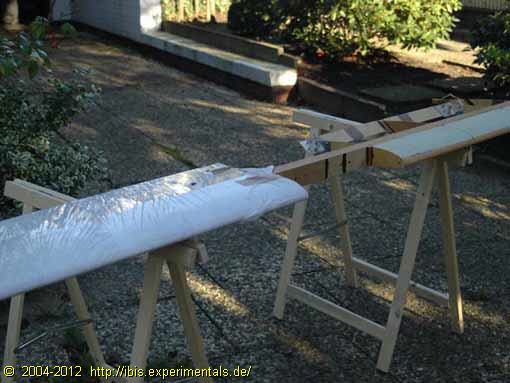 After glueing the spar caps and some internal reinforcments in way of the ribs, both the front- and backside get covered with a plywood shear web.