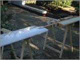 Today I prepared a board to assemble the canard wing tips on. The plywood board is a 3 centimeter (1-1/5") thick job to assure a flat working surface and to minimise distortion when the epoxy sets. Of course it will be covered with a sheet of polyethylene so that the epoxy is not going to glue aircraft parts to the assembly board.