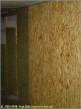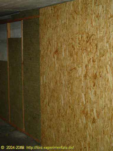 I mounted 6 cm (almost 2.5") wooden girders to the wall and put 6 cm insulation material in between them. That green stuff you see on the left side of the picture is the insulation material. This setup is covered with 12 mm (appr. 0.5") particle board. So, all in all, the walls got covered with 7.5cm (3") worth of material for thermal isolation and sound proofing.